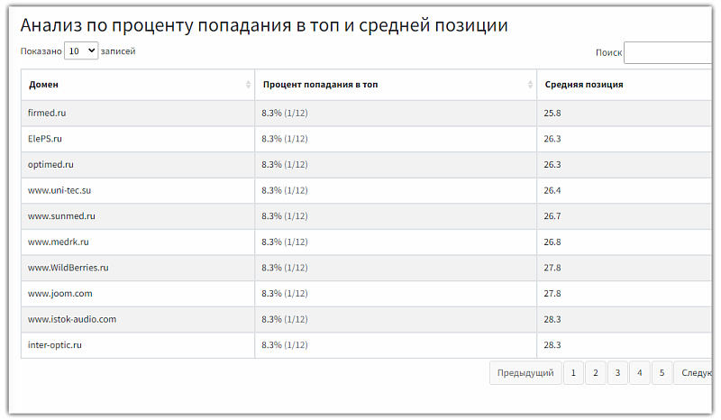 Если ключевых слов много, то процесс длится чуть дольше. При минимальном количестве ключевых фраз система автоматически формирует результат и выводит на экран. Платформа покажет следующие параметры: