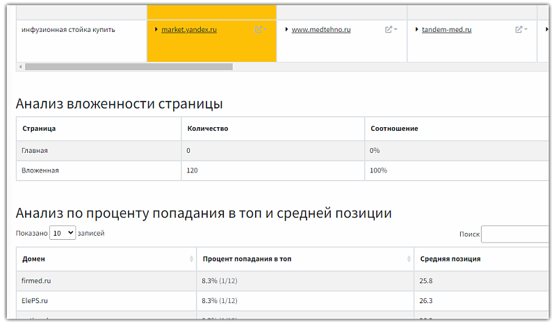 - Детализация тегов. Результат анализа содержит детализацию тегов по каждому проанализированному ресурсу. В окошке можно увидеть, какие фразы и слова использованы для SEO-оптимизации контента.