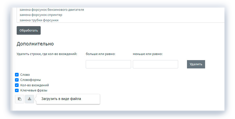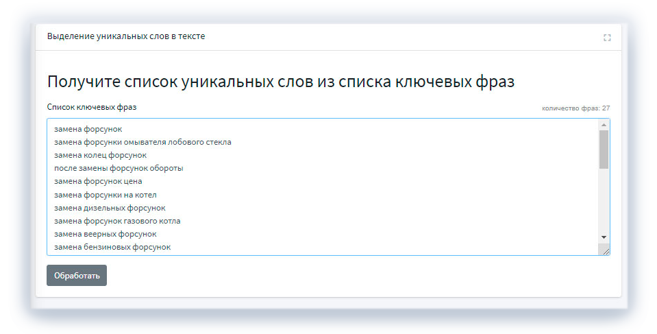 Оптимизация уже подобранного SEO-ядра и анализ готового текста (например, с сайта-конкурента) для выборки ключей. В первом случае сервис подойдет для создания технического задания авторам, удаления дублей и других неуникальных вхождений.