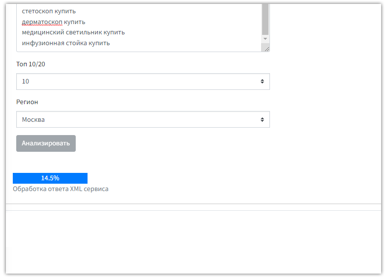 Чтобы анализировать ресурс, предварительно следует собрать список ключевых слов. В сервисе есть опция анализа по регионам. Проанализировать можно 10 или 20 релевантных ресурсов конкурентов. Загрузите список ключевых слов в специальную форму, выберите количество сайтов для анализа и жмите на опцию запуска анализа.