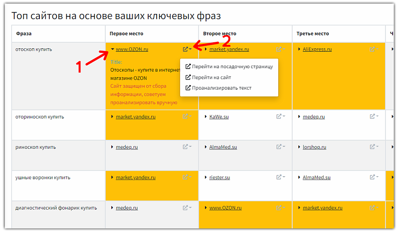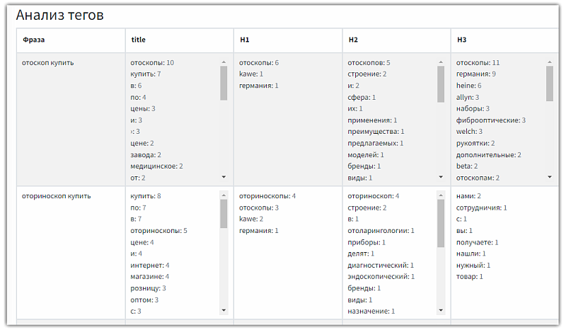 - Детализация тегов. Результат анализа содержит детализацию тегов по каждому проанализированному ресурсу. В окошке можно увидеть, какие фразы и слова использованы для SEO-оптимизации контента.